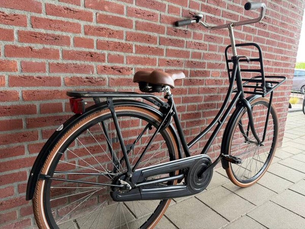 De combinatie van het zwarte frame met het bruine zadel en de bruine banden geeft de fiets een luxe retro-look. Dankzij de stevige voordrager neem je moeiteloos een krat of mand mee.
